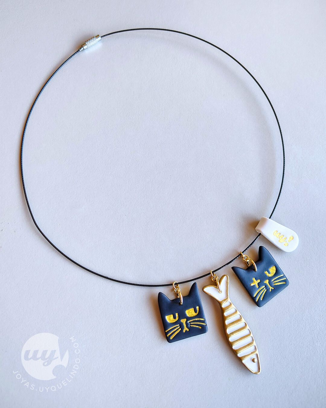 El choker de gatos sospechosos reúne a los dos personajes de la colección en una sola pieza: el Gato Negro Sospechoso y el Gato Negro Tuerto, ambos modelados a mano en arcilla polimérica negra, con detalles pintados a mano en dorado. Entre ellos cuelga un pez blanco y dorado, como si fuera el centro de una escena que ocurrió hace un momento… o está a punto de ocurrir.