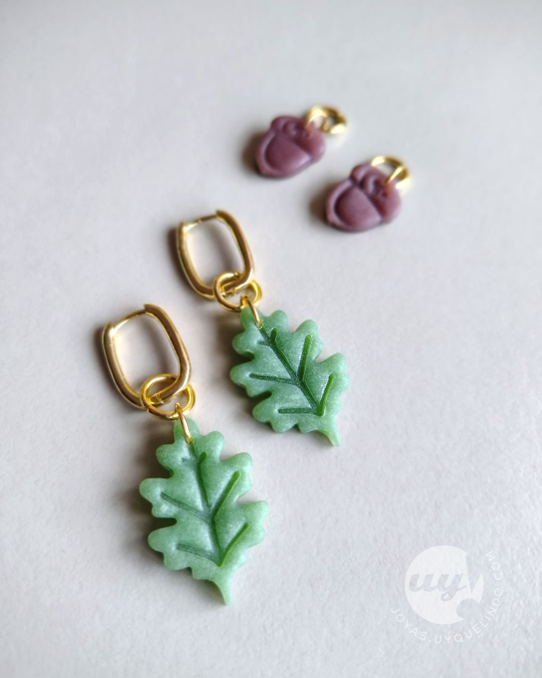 Los Pendientes Carballo son modulares e inspirados en el carballo gallego, compuestos por una hoja y una bellota. Fabricados en arcilla polimérica y acero chapado en oro de 18 k. Los huggies miden 16 mm y el largo total del pendiente es de 55 mm. Incluyen dos dijes intercambiables que permiten llevarlos juntos, por separado o de forma asimétrica.